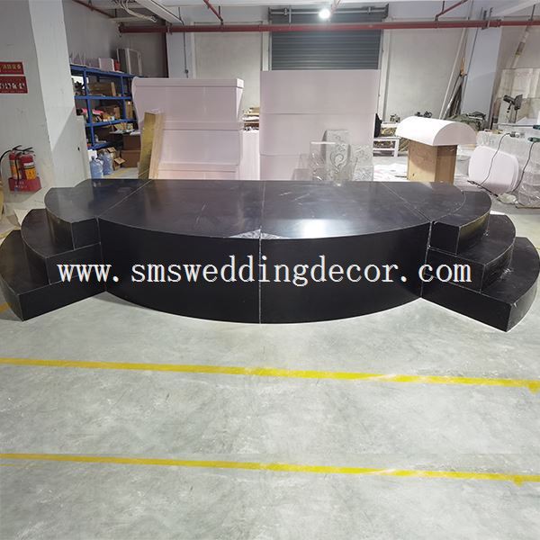 این استیج نیم دایره مشکی دارای 3 قطر مرجع 3.6 متر، 3.8 متر و 5.5 متر است. به عنوان مثال مرحله نیم دایره با قطر 3.8 متر را در نظر می گیریم، 4 قسمت آن دارای ابعاد زیر است: 190cm*120cm، 150cm*70cm. و هر دو طرف مرحله عروسی داخلی دارای 3 سطح مرحله است.